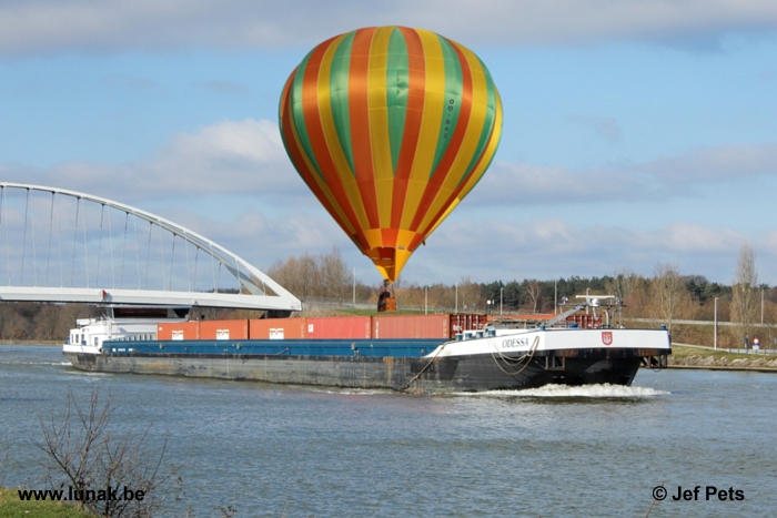 Regelmatig trek ik naar het Albertkanaal in Viersel om daar in alle rust en stilte naar de binnenschepen te gaan kijken. Zo was ik daar ook op 14 februari 2026, een zalige zonovergoten dag. Omstreeks 15.35 uur was ik er getuige van een bizar voorval. Ik zag een ballon redelijk laag komen aanvliegen. De ballonvaarder van de Cameron C-80 warme luchtballon met Belgische registratie OO-BAZ wou duidelijk in een weide langsheen het kanaal gaan landen. Om één of andere reden zakte de ballon plots te snel zodat het landen op de begane grond niet meer mogelijk bleek. De ballonvaarder nam de keuze om niet in het koude water te landen met alle risico’s van dien voor zijn passagiers en zichzelf. Wegens het plotse hoogteverlies en met het schip in zijn traject oordeelde de piloot om zijn ballon neer te zetten op één van de containers op het schip. Het bleek de juiste beslissing te zijn en de landing gebeurde feilloos. De volgende brug op het kanaal was gelukkig nog een eind verder waardoor het schip snelheid kon terugnemen. De ballonvaarder hield zijn ballon rechtop met de brander terwijl de schipper naar de steiger van een verderop gelegen bouwbedrijf voer. Hier werden de ballonvaarder en zijn twee passagiers veilig aan wal afgeleverd. Het duurde nog wel even alvorens de ballon afgetuigd kon worden, maar ook dat verliep zonder schade.