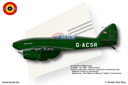 G-ACSR, de groene DH88 die 3e werd in de McRobertson Air Race, vertrok op 20 december 1934 vanaf het vliegveld van Evere met bestemming het toenmalige Leopoldstad in Belgisch Congo (tegenwoordig Kinshasa, hoofdstad van de Democratische Republiek Congo). Het toestel was “Reine Astrid” gedoopt en werd gevlogen door de Brit Ken Waller met de Belg Maurice “Teddy” Franchomme als navigator. Behalve de 2 bemanningsleden was ook de voor onze kolonie bestemde Kerstpost aan boord. De speciale postvlucht werd “Raid Rubin” genoemd, naar de naam van de sponsor/eigenaar van het toestel (de Australiër Bernard Rubin).