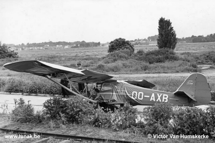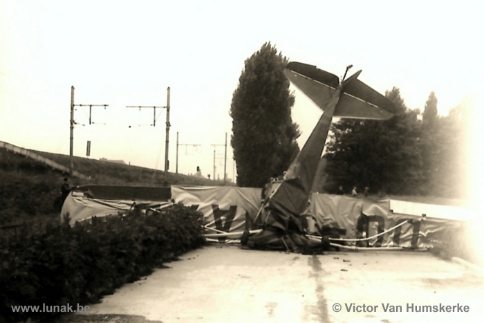 Na het ontkoppelen van de startkabel is deze op de vleugel van de Auster terecht gekomen. OO-AXB verloor alle controle en is in een loodrechte verticale duikvlucht gecrasht op de betonweg ten zuiden van het vliegveld naast de spoorweg (om de locatie beter te situeren ziet u op de eerste foto, tussen de twee bosjes aan de overzijde van het veld, hangar B en de toren van de Sint-Jozef kerk)”.